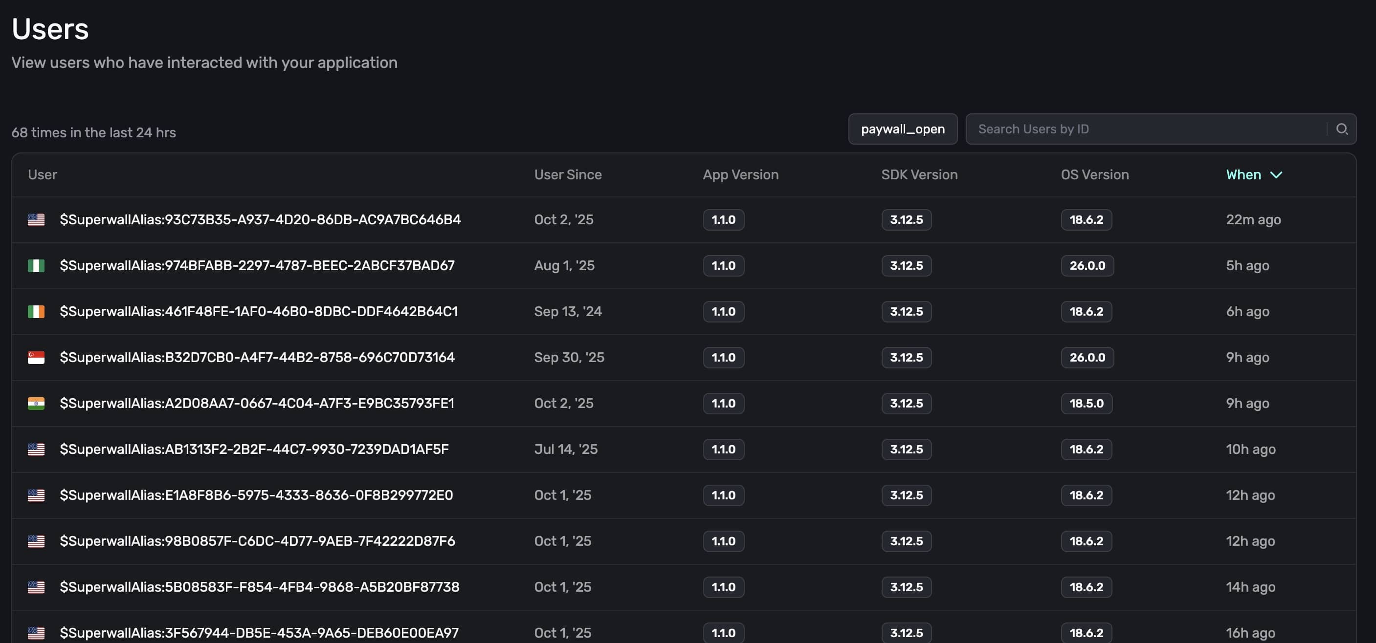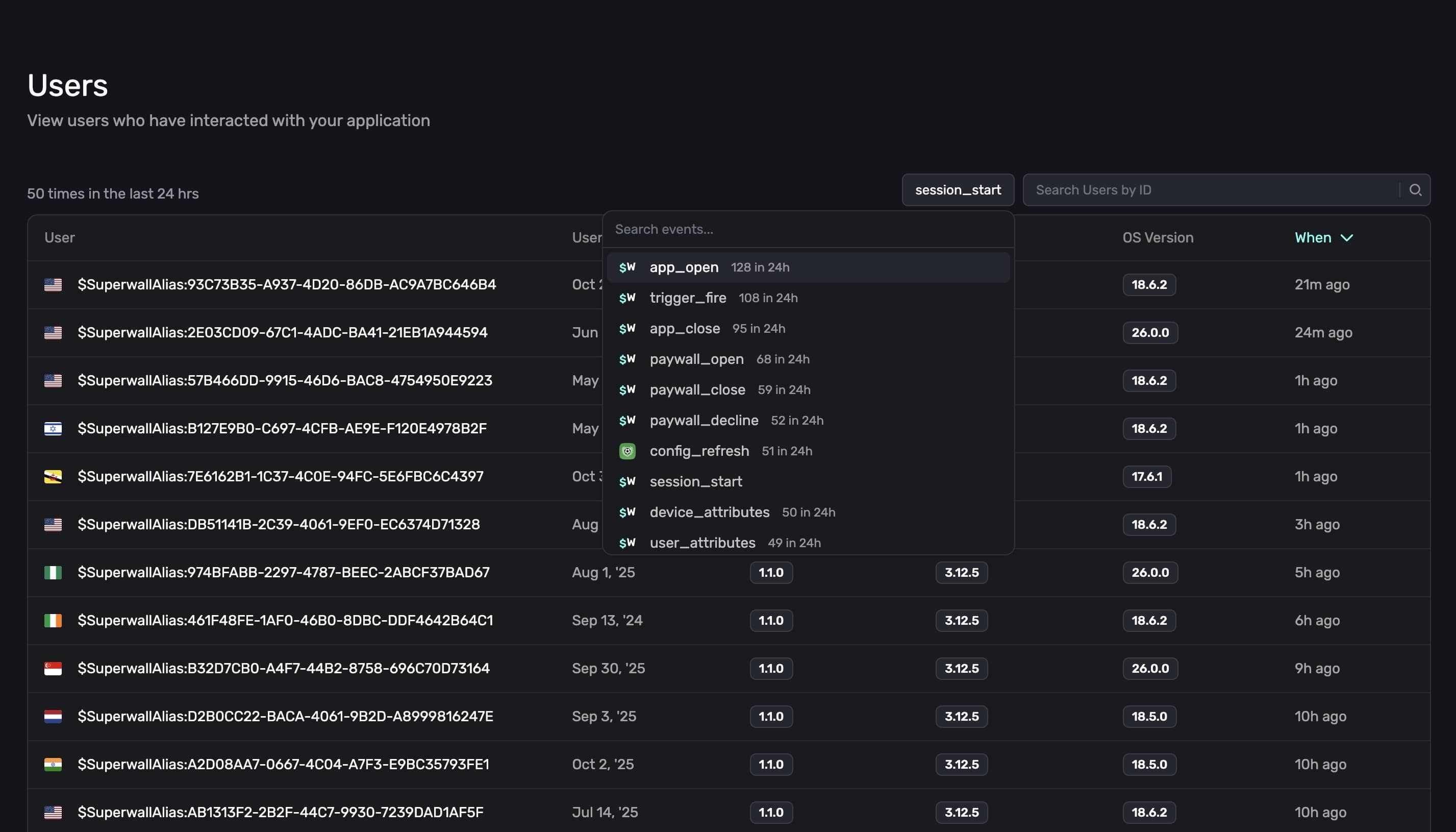 Below, Superwall displays all of the users who have opened a paywall the last 24 hours: