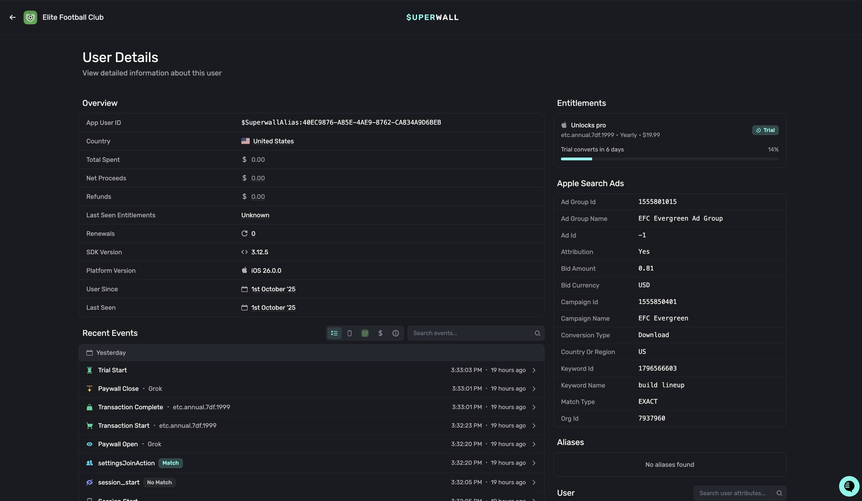 4. Aliases: Any alias that Superwall has assigned the user will show here. Read more about how user aliases are created here.