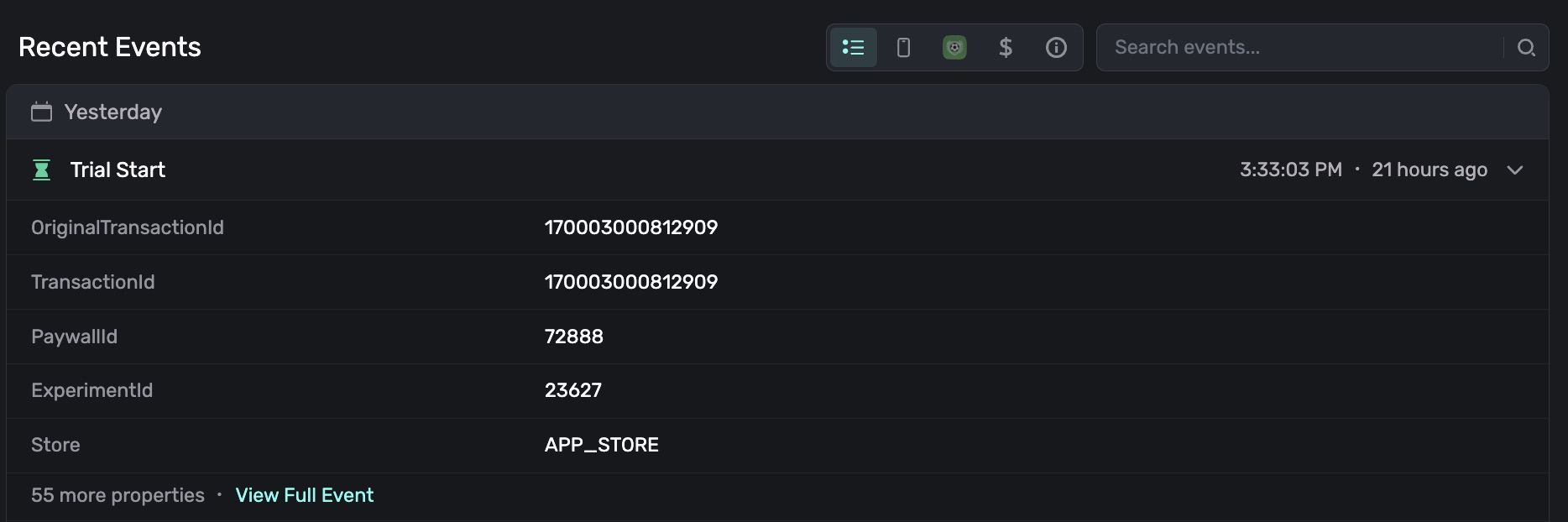 2. Recent Events: View revenue events and conversions, SDK events, and see the overall breadcrumb of actions the user has taken. You can filter or search by certain events as well.